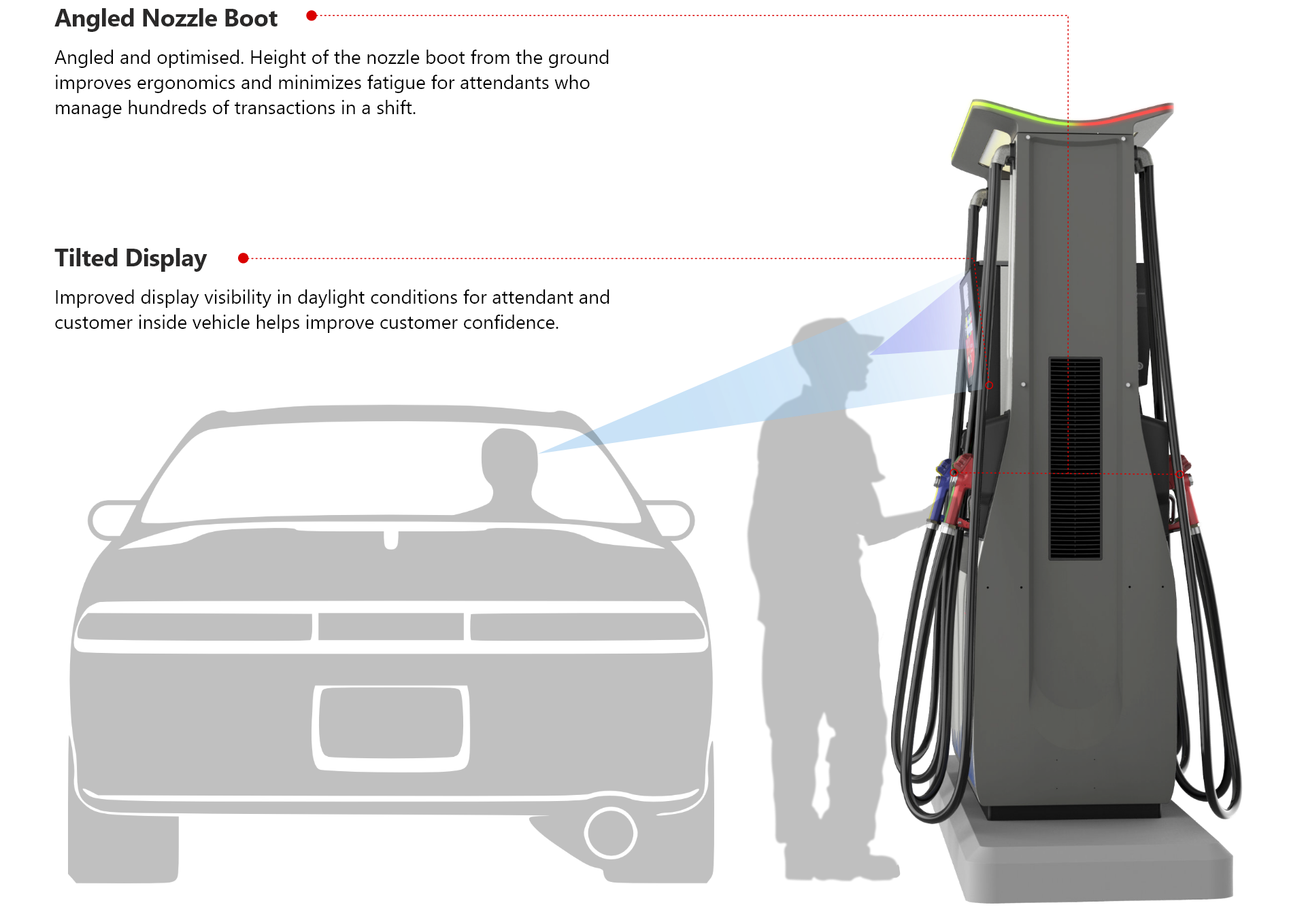 Attendants perform hundreds of operations with the dispenser during their shift, so their comfort and convenience is absolutely vital to better customer service and operational efficiency. Perfectly positioned screens and input areas as well as a comfortable nozzle height reduce attendant fatigue.