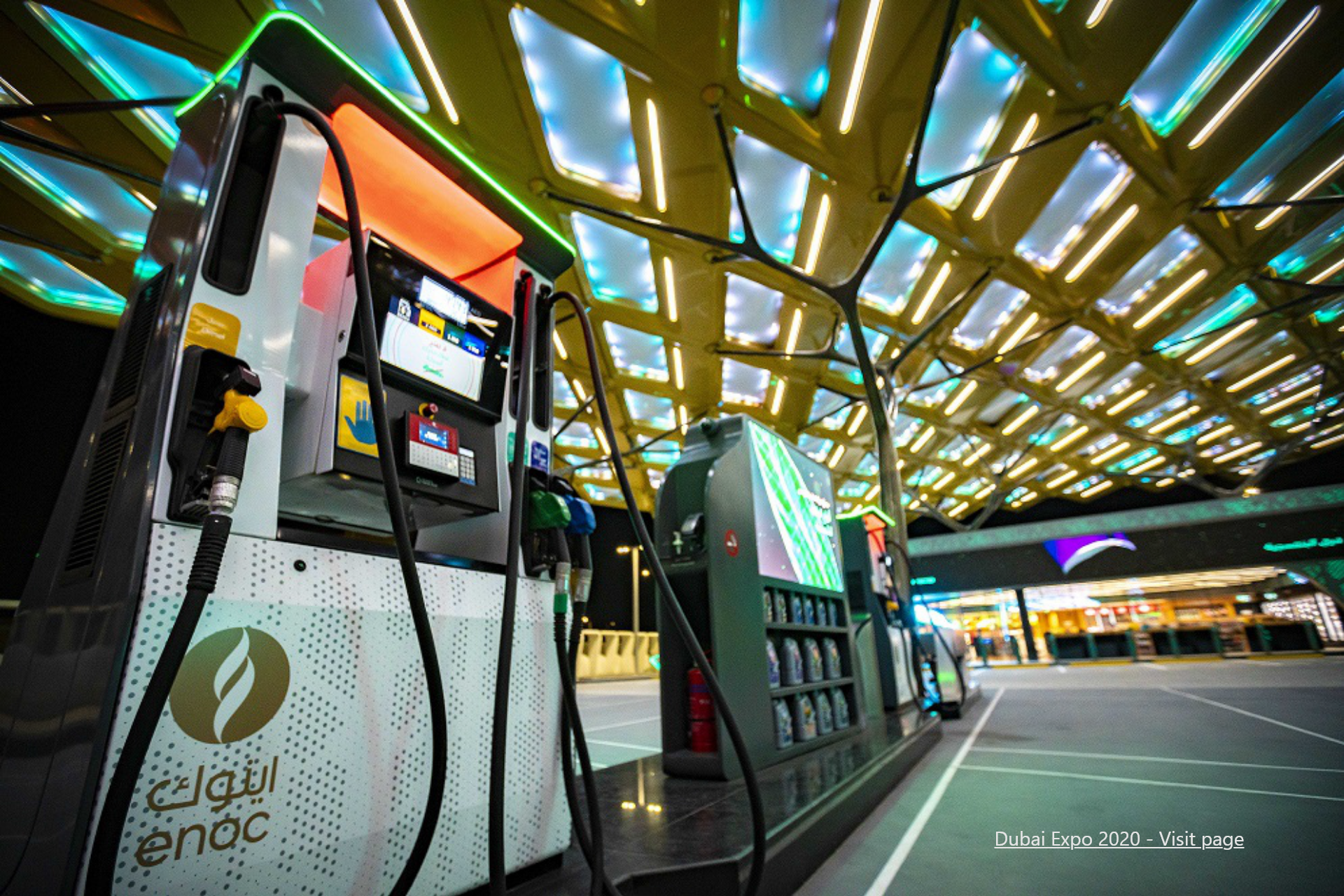 The large curved canopy light illuminates the dispenser as well as the forecourt around it.