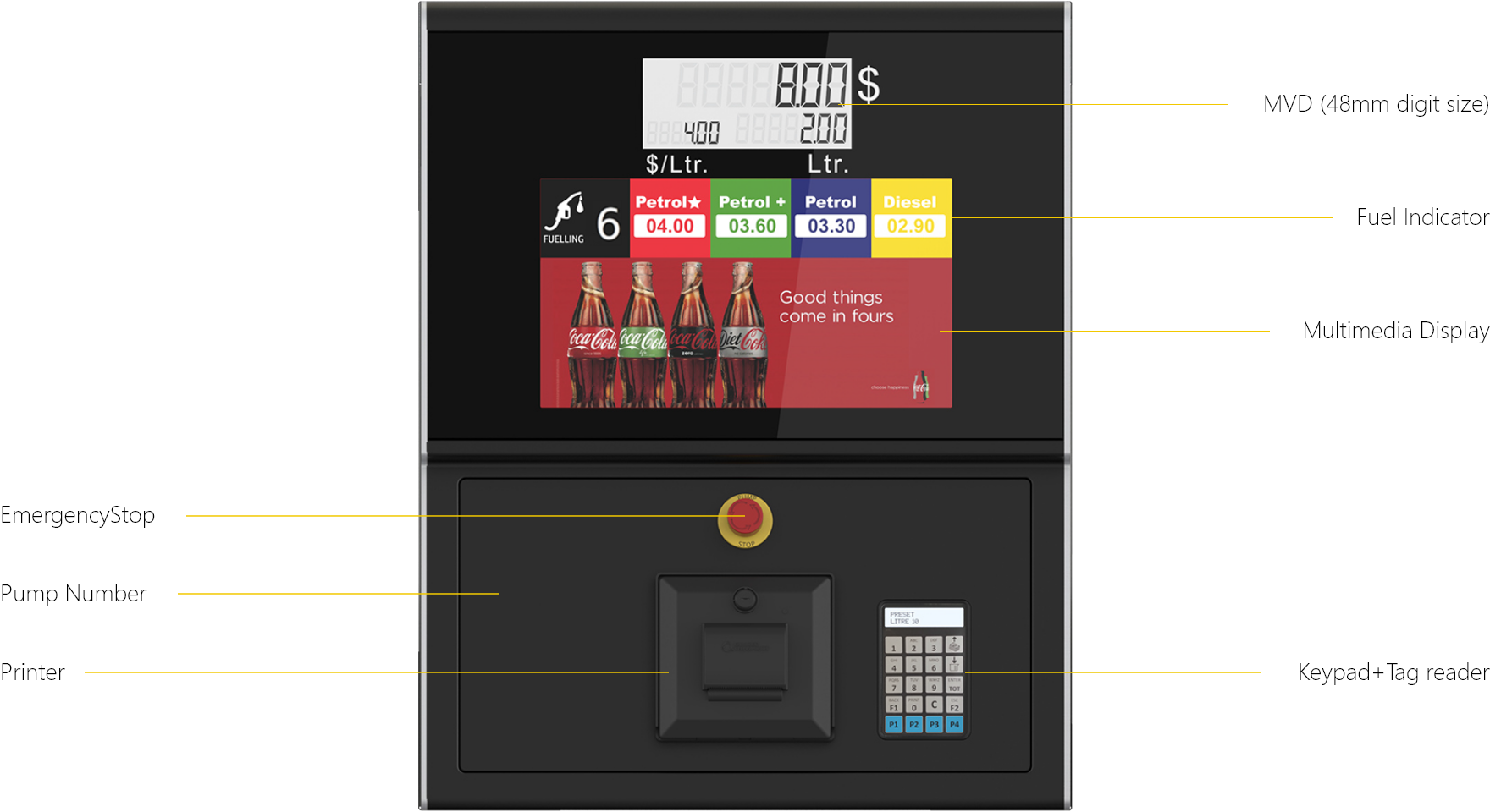 The interface for the CDM box was designed with efficiency and clarity in mind. Clear indications for price, amount, fuel and the pump number make for easy viewing, from up close by or at a distance.