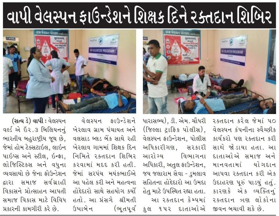 A large-scale blood donation drive was organized in collaboration with Kherlav Gram Panchayat and Valsad Blood Bank on the occasion of Teachers' Day