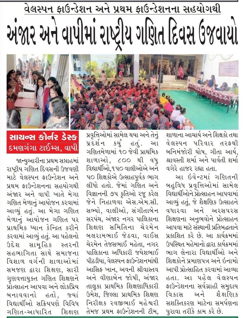 National Mathematics Day celebrated in collaboration with Pratham Education in Anjar and Valsad through the Welshiksha initiative by Welspun Foundation