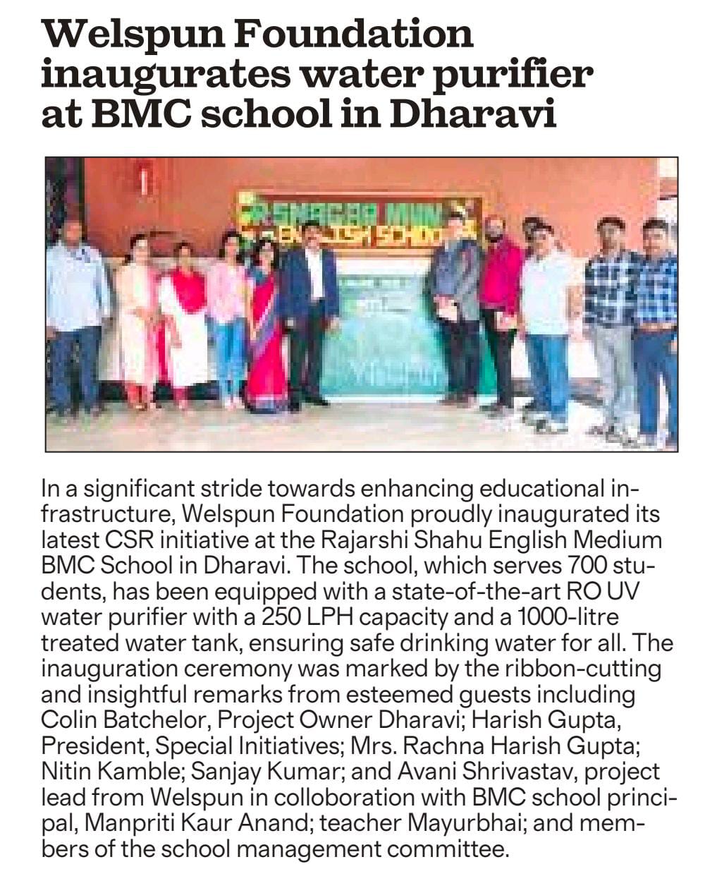 Welspun Foundation inaugurates RO water purifier at BMC school in Dharavi